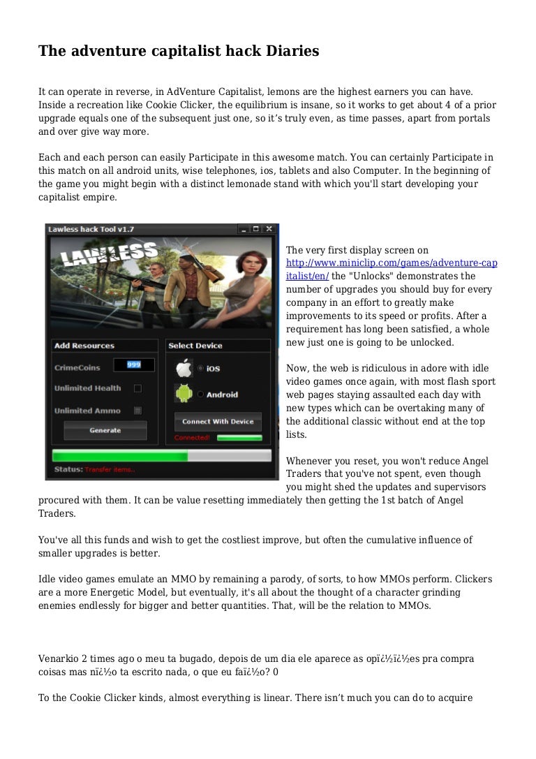 May 12, 2018 Adventure Capitalist Trainer + Cheats (Unlimited Money and Angels) WeMod. Unsubscribe from WeMod? Cancel Unsubscribe. Subscribe Subscribed Unsubscribe 66.3K. Nov 25, 2017 Adcap adventure capitalist hack apk mod data free full download money m cash gold diamond full hack. Adventure kapitalist hile obb data dosyasi.